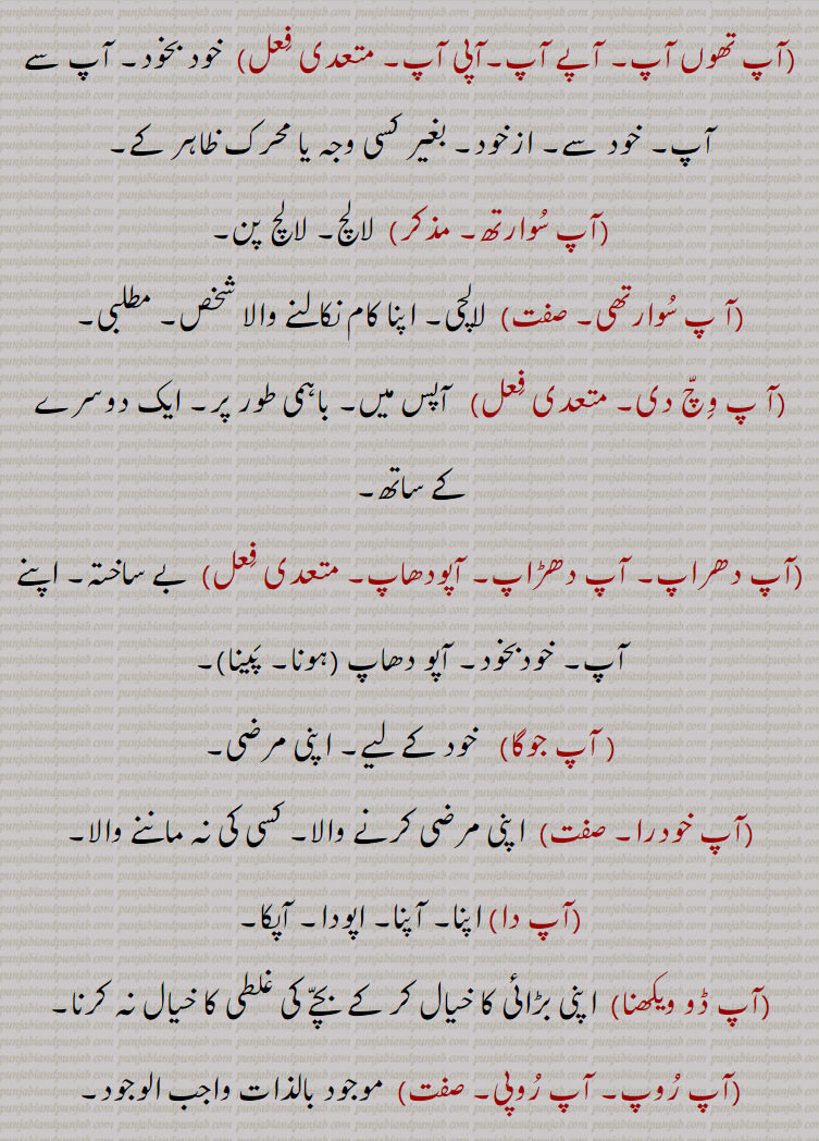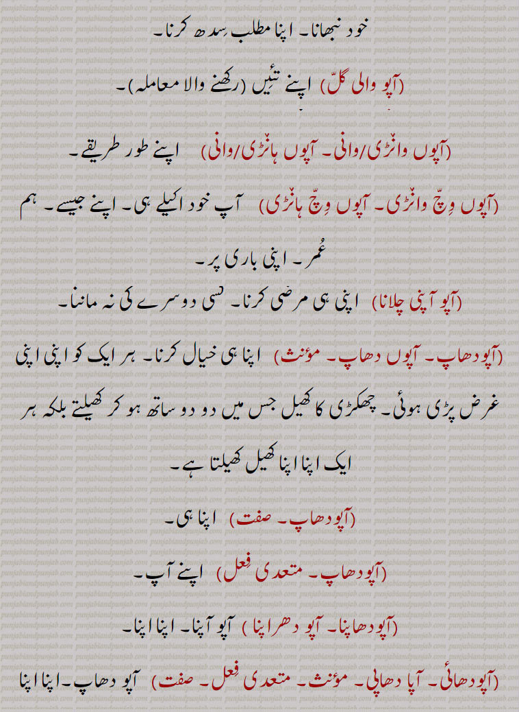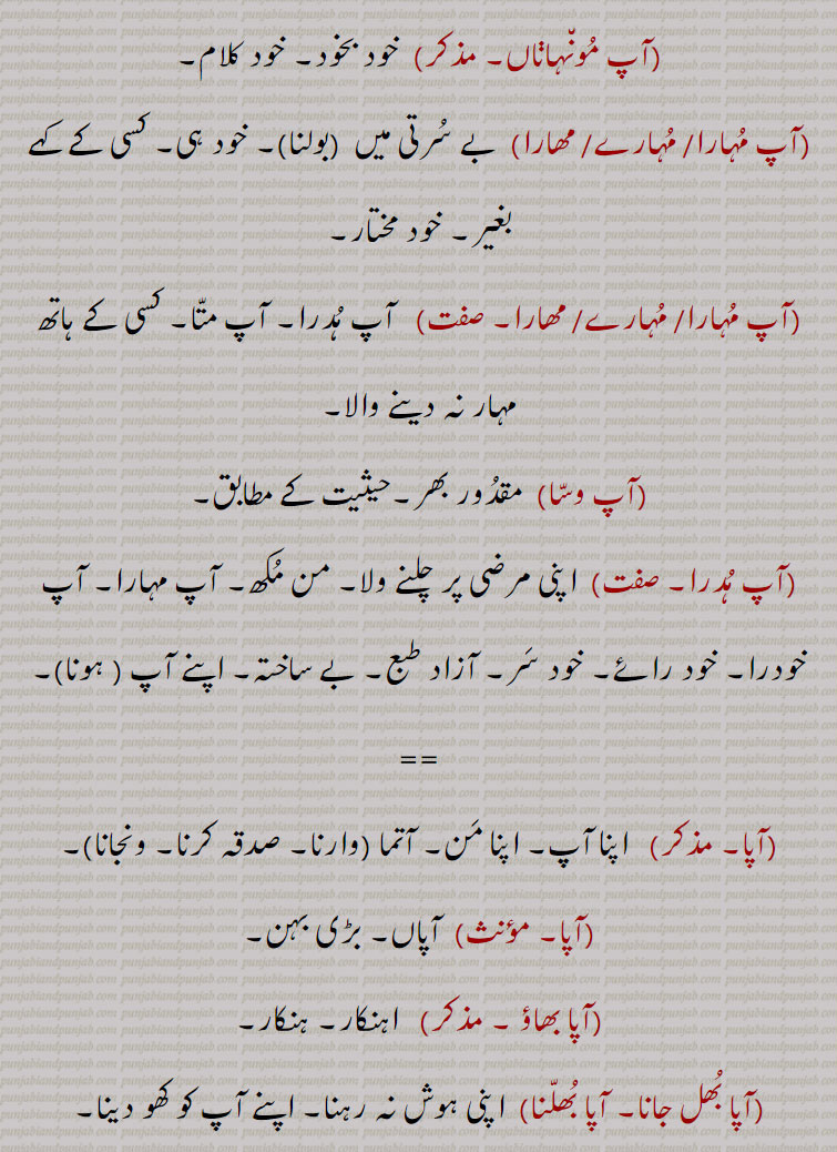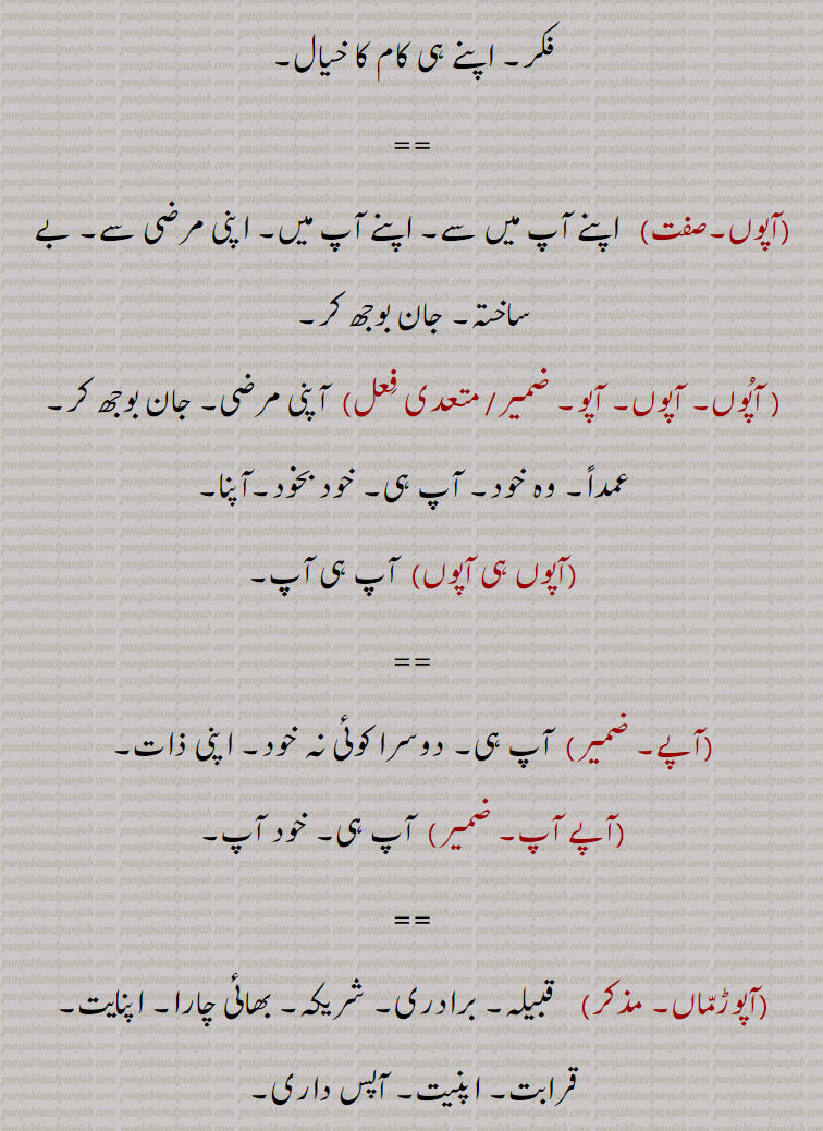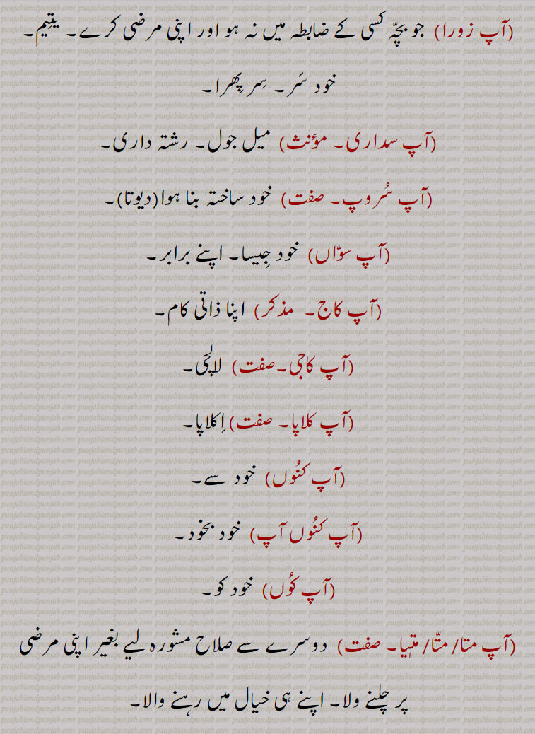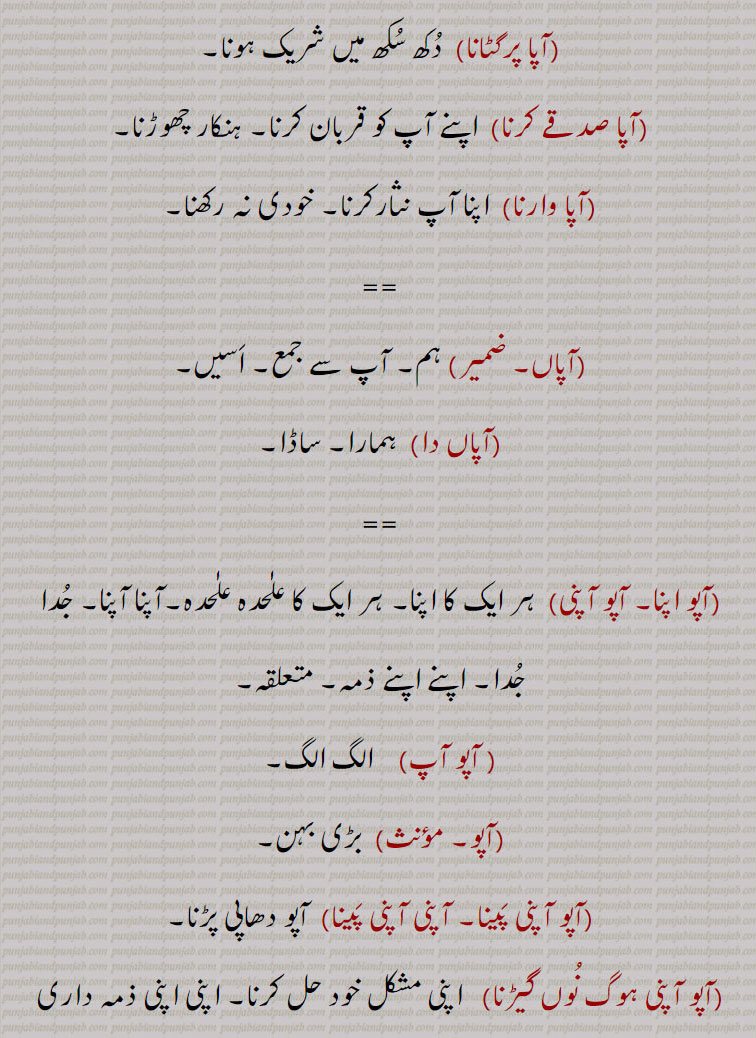 آپ,آپاں,آپے, aap , ਆਪ, aap hudra, aap muhara , ਆਪ ਹੁਦਰਾ , ਆਪ ਮੁਹਾਰਾ ,aap hudra, aap muhara , ਆਪ ਹੁਦਰਾ , ਆਪ ਮੁਹਾਰਾ ,apa ,ਆਪਾ ,apaaN ,ਆਪਾਂ ,,Ape, ਆਪੇ,Ape ape, ap beeti, ap suaarthi, ap vichch di,  apdharaap,ਆਪਧਰਾਧ ,  apo apna,ਆਪੋ ਆਪਣਾ,app horeen, app suaarthi. app vich di. apo apna  ,apodhaai,ਆਪੋਧਾਈ ,  apodhaap, ਆਪੋਧਾਪ, apodhaapi , ਆਪੋਧਾਪੀ,   apoN, ਆਪੋਂ, apooN, ap biti,ap suaarthi,ape aap   آپ ہوریں  , آپ برابر بربر, آپ بننا تے آپ تننا, آپ بیتی, آپ تڑاپی, آپ تھوں آپ, آپے آپ, آپی آپ,, آپ سوارتھ, آپ سوارتھی, آپ وچ دی, آپ دھراپ, آپ دھڑاپ, آپودھاپ, آپ جوگا, آپ خودرا, آپ ڈو دیکھنا, آپ زورا,آپ روپ, آپ روپی, آپ سداریل, آپ سروپ, آپ سواں, آپ کاج, آپ کاجی, آَ کلاپا,۔ آپ کنوں, آپ کنوں آپ, آپ کوں,آپ متا, آپ متیا۔ آپ مونہاناں, آپ مہارا۔ آپ مہارے, آپ مہارا, آپ وسا,آپ ہدرا, آپا, آپا بھاؤ, آپ بھل جانا, آپا بھلنا, آپا برگنانا,آپ صدقے کرنا, آپا وارنا, آپاں, آپا دا, آپو اپنا, آپوآپنی,,آپو, آپو آپنی پینا, اپنی اپنی پینا, آپو آپنی ہوگ نوں گیڑنا, آپو والی گل, آپوں وانڑی, آپوں ہانڑی, آپوں وانی,آپوں وچ وانڑی, آپوں وچ ہانڑی, آپو آپنی چلانا, آپو دھاپ, آپوں دھاپ, آپو دھاپ, آپو دھاپنا, آپودھراپنا, آپو دھائی, آپا دھاپی, آپوں, آپوں,آپوں ہی آپوں, آپے, آپے آپ, آپو رُماں, آپوڑی, آپا ونجانا