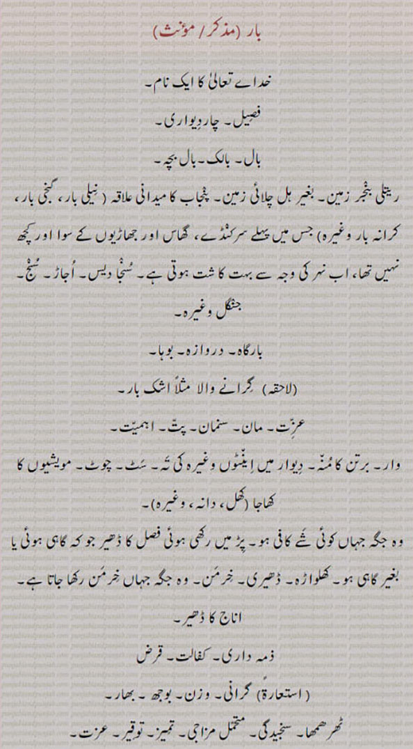 ,baar, ਬਾਰ, بار, فصیل, بال بچہ، بالک, بال, بارگاہ, بوہا, اجاڑ, سنج, ریتلی بنجر زمین, مان, اہمیت,برتن کا منہ, مویشیوں کا کھاجا, پڑ میں رکھِ فصل کا ڈھیر, کھلواڑہ, خرمن, اناج کا ڈھیر , بھار, قرض,توقیر, بنڈل, کھیپ, رواں, ثمر, حمل رسائی,