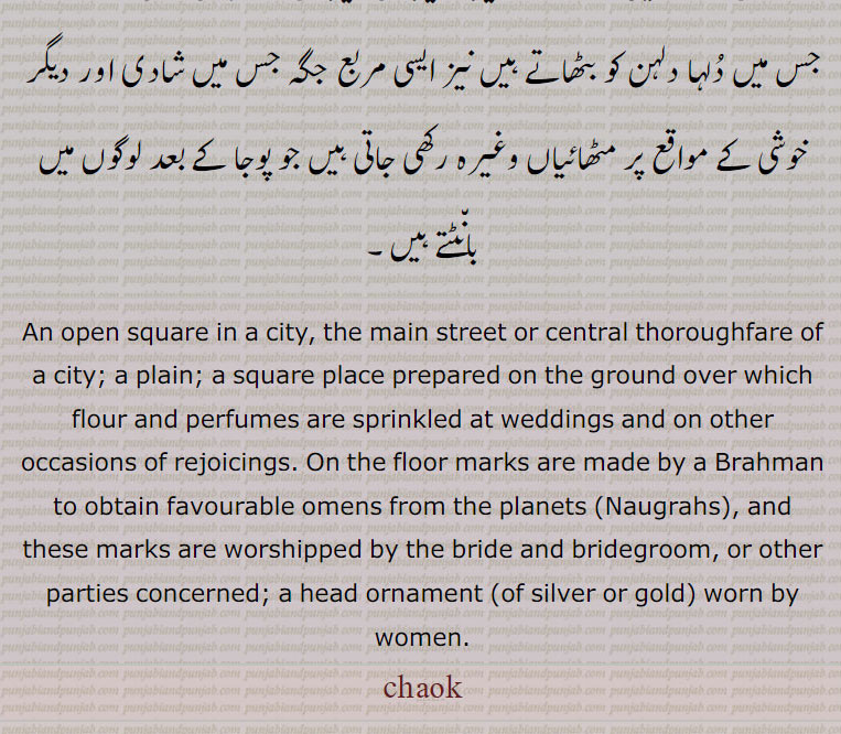 چوسر کھیلنے کا کپڑا,طوائفوں کی بستی یا محلہ۔ چکلہ,ایک قسم کا زیور جو عورتیں سَر پر پہنتی ہیں جو تین اُلٹی کٹوریوں کی ماننٛد ہوتا ہے درمیان والی کٹوری بڑی ہوتی ہے، ٹّوٹھی، سگّی پُھل,ہنٛدوؤں کے رن٘گین آٹے اور عبیر وغیرہ کی لکیروں سے بنائی ہوئی چوکور جگہ جس میں دُلہا دلہن کو بٹھاتے ہیں نیز ایسی مربع جگہ جس میں شادی اور دیگر خوشی کے مواقع پر مٹھائیاں وغیرہ رکھی جاتی ہیں جو پوجا کے بعد لوگوں میں بان٘ٹتے ہیں,An open square in a city, the main street or central thoroughfare of a city; a plain; a square place prepared on the ground over which flour and perfumes are sprinkled at weddings and on other occasions of rejoicings. On the floor marks are made by a Brahman to obtain favourable omens from the planets (Naugrahs), and these marks are worshipped by the bride and bridegroom, or other parties concerned; a head ornament (of silver or gold) worn by women.chauk, chaok,
