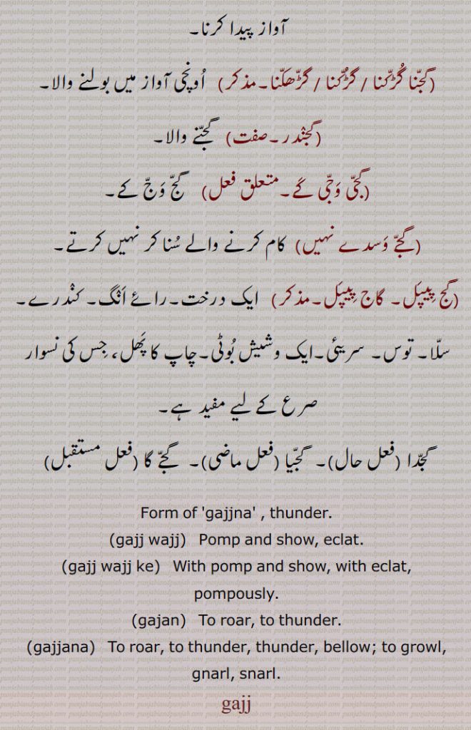 گج,گاج ,گرج, بادل کا ایک مرتبہ گرجنا,جمع گاجاں,گج پانا,گج پینا, رولا پینا, دھماں پینا,گج وج کے,گج وج ,گجانا,گجدا وجدا,گجکاٹ,گجکار,گجکنا,گجنا,گجنا,گجن,گجنا گڑکنا / گڑکنا / گڑھکنا,گجندر,گجی وجی کے,گجے وسدے نہیں,گج پیپل, گاج پیپل,رائے انگ, کندرے, سلا, توس, سریئی, گجدا ,  گجیا , گجے گا, gajj wajj,  ਗੱਜ ਵੱਜ, Pomp and show, eclat,gajj wajj ke,  ਗੱਜ ਵੱਜ ਕੇ , gajan,  ਗਜਣ, gajjana,  ਗੱਜਣਾ , thunder, to growl, gnarl, گج, gajj, ਗੱਜ,,