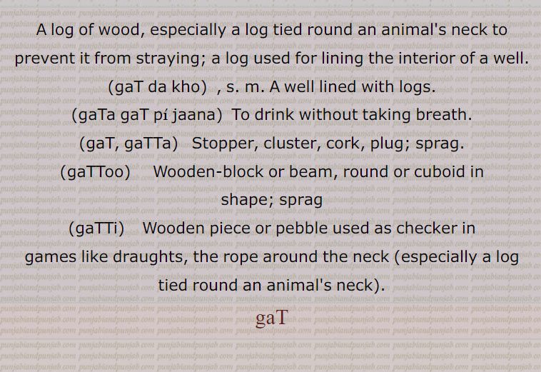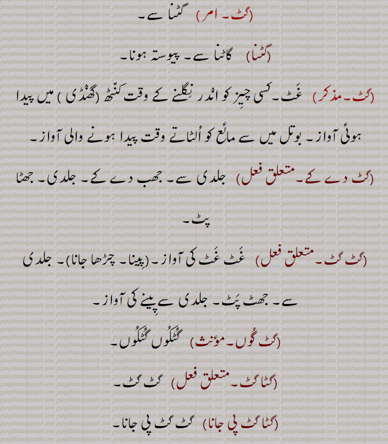 ,گٹ دا کھوہ, گٹو, گٹی, گلاواں, گٹا, گٹنا, گٹ دے کے, گٹ گٹ,غٹ غٹ کی , گٹ گوں,  گٹکوں ,گٹا گٹ,گٹا گٹ پی جانا,, گٹ  ,gat, ਗਟ, gat da kho,gaTa gaT pi jaana,gat, gatta, ਗੱਟਾ ,gattoo,  ਗੱਟੂ, gatti,  ਗੱਟੀ,
